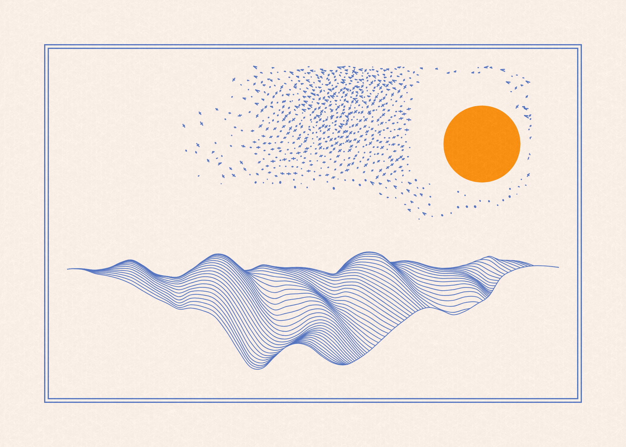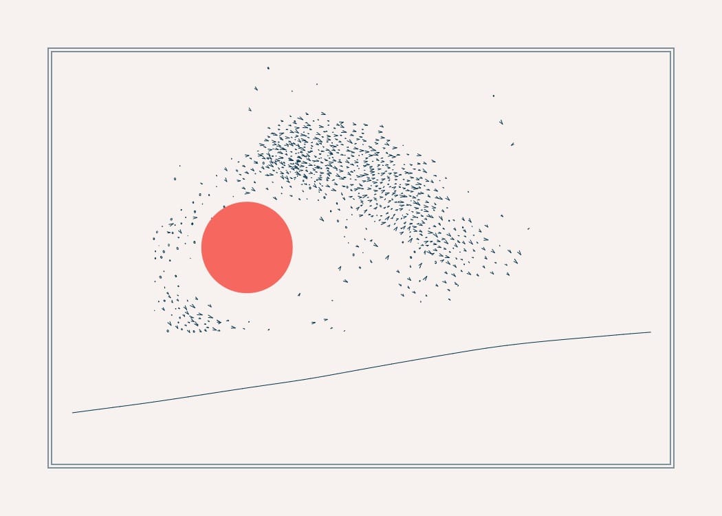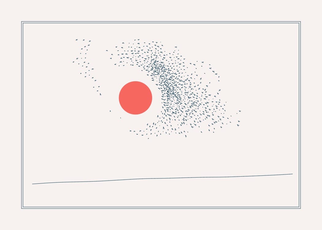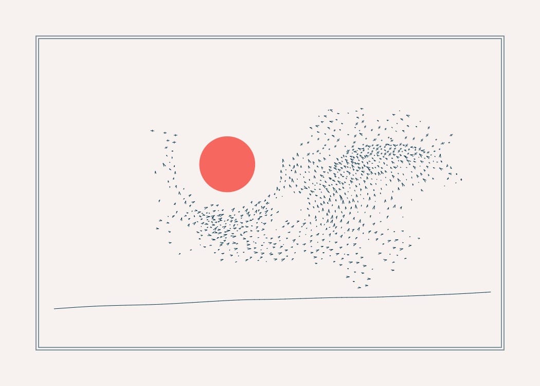 I realised I would need to draw upwards of 50,000 boids to properly simulate a murmuration. Even with a grid system in place, this is too much work for standard CPUs and would necessitate using the GPU. Whilst there are many projects out there that achieve this (with or without external libraries), drawing this many boids caused another problem: plotting the image on the Axidraw would still be extremely time consuming. I opted therefore to produce small prints with fewer than 2,000 boids so that a plot could finish in under an hour.