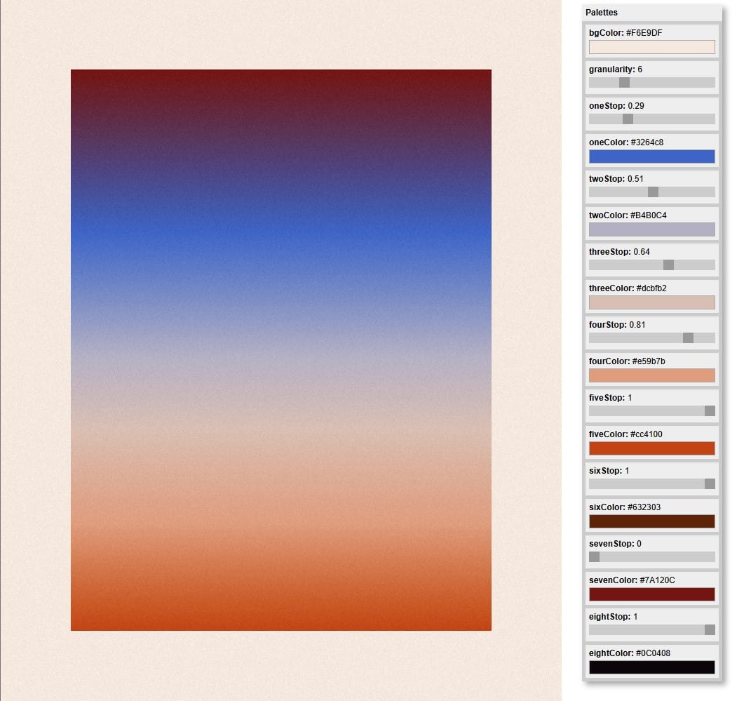 In many of the game theoretic simulations I have been investigating belief, or some other state of the agent, is represented as a decimal between 0 and 1. In order to visualise that, a colour scale is very appropriate. So for example if we wanted to express political affliation, a gradient between blue and red is immediately very easy to parse. As there are many different libraries for colour mixing in Javascript in order to investigate this further I made a number of studies, creating a number of different palettes in order to explore this. Here are some of the studies I produced which I released on rodeo.club