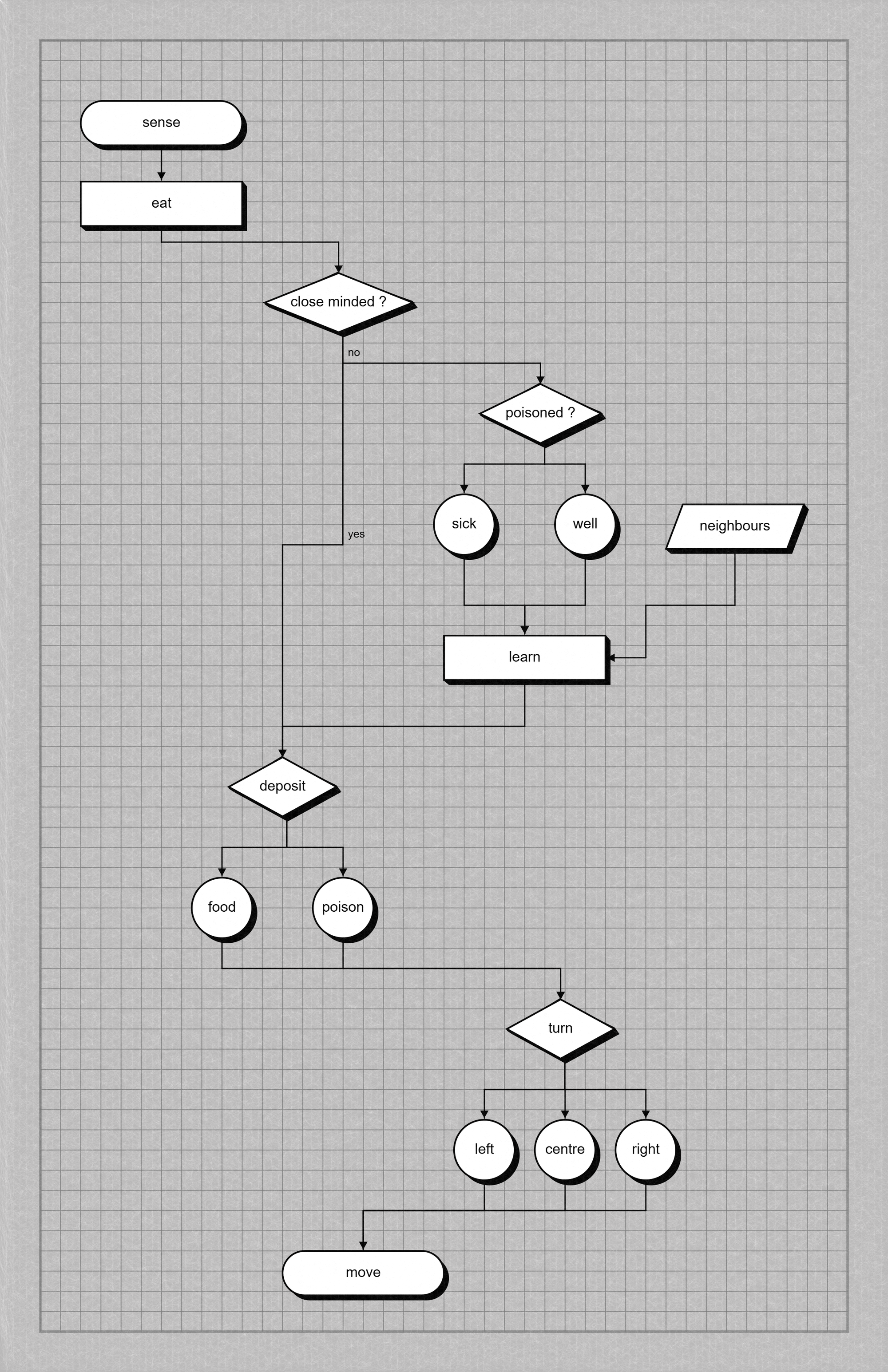 In his original paper, Atsushi Tero and his co-authors presented an agent-based computer model that simulates the route-finding capabilities of slime mould. Slime and Reason is an adaptation of this model. The underlying algorithm is deliberately simple, and will be familiar to anyone acquainted with swarm systems such as The Boids. Each agent has three sensors: left, right and centre. At each step, the agent senses nearby food and either turns left, turns right, or continues straight on. As agents move, they deposit a chemical trail that can be sensed by others. Over time, frequently travelled routes are reinforced, while inefficient paths gradually disappear. For this reason, this model often functions as a kind of benchmark: it brings together, in condensed form, most of the behaviours that multi-agent systems are designed to capture. But this prominence is not entirely neutral. The behaviours it unifies—mapping, foraging, transportation, consensus formation—are taken to be significant precisely because they align with an underlying and somewhat economic view of society.
