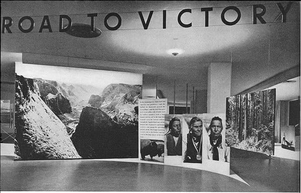 As Fred Turner describes in The Democratic Surround, their answers to these questions ultimately produced what he called "the ecstatic multimedia utopianism" of the 1960s and, through it, much of the multimedia culture we inhabit today. They argued that mass media failed to reflect the plurality of voices that made America and Americans strong. In order to demonstrate an alternative they put on an exhibition, The Road To Victory, at the Museum of Modern Art in New York. The exhibition presented vistors with an array of visual materials and three dimensional environments within which they could mold their own opinions. Influenced by Dewey's pragmatism, it offered visitors a chance to take part in a deliberative process with a greater degree of agency than radio afforded. In the words of Fred Turner, the exhibition "created an extended field of vision in which American viewers might glimpse utopia. But this time, it would not be the socialist utopia of [the Bauhaus]. On the contrary, it would be the liberal utopia of a world managed from afar by an all-seeing and technologically all-powerful United States." (The Democratic Surround, pages 111-2).